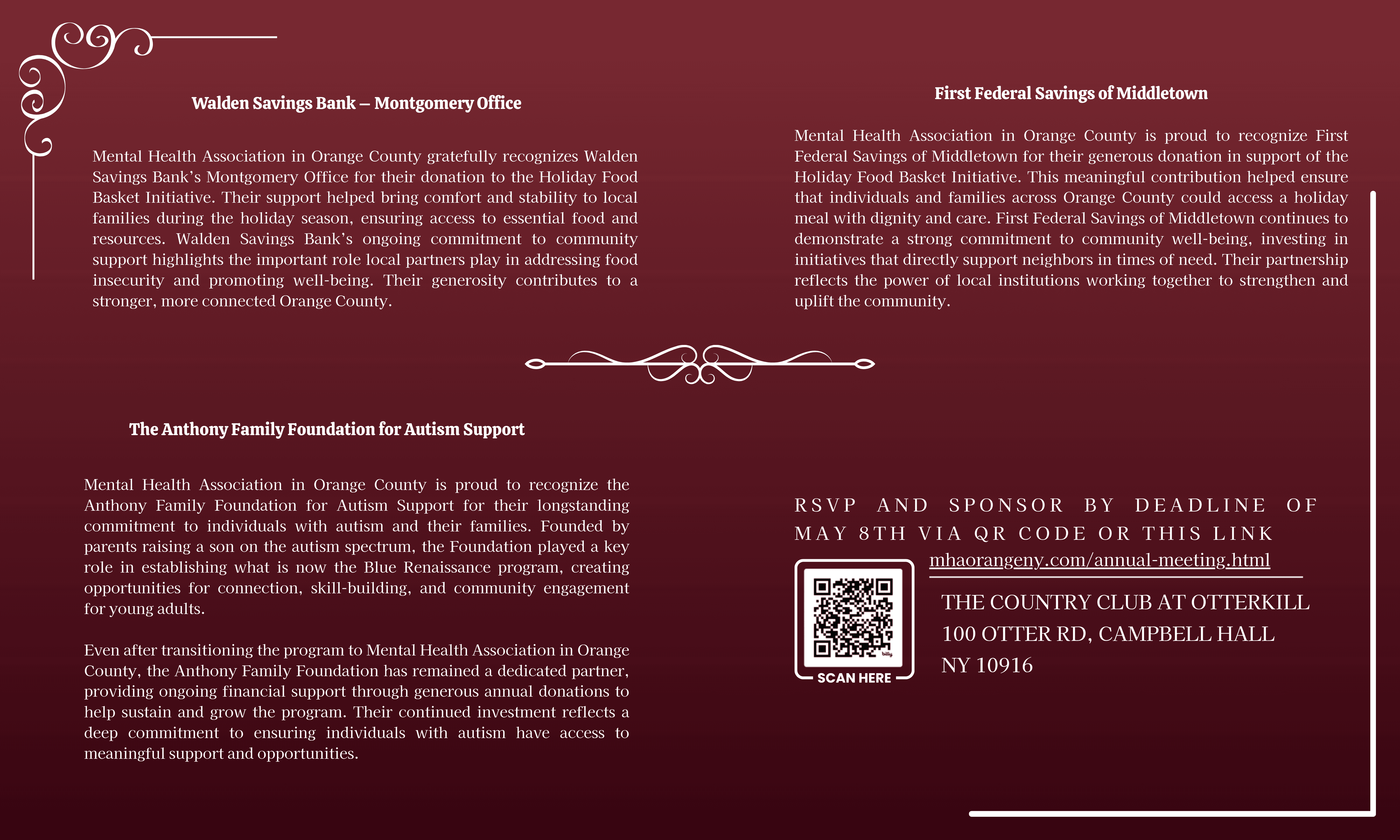 Mental Health Association in Orange County’s Annual Meeting and Awards Ceremony celebrates the people, partnerships, and progress that strengthen our community. Each year, supporters, partners, local businesses, and community leaders gather to reflect on the impact of our work and recognize individuals and organizations whose dedication advances mental health, recovery, and well-being across Orange County. This event brings together nonprofit partners, civic leaders, and businesses that share a commitment to a stronger and healthier Orange County.