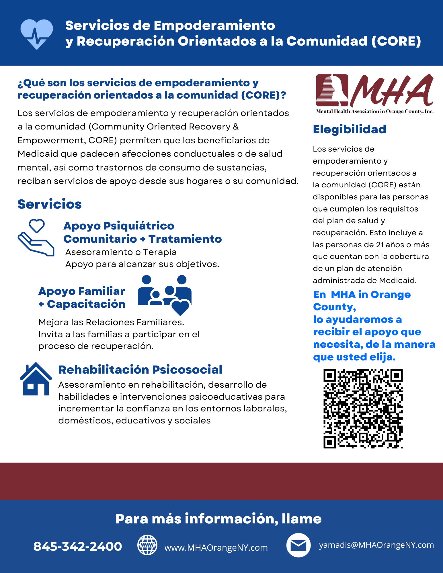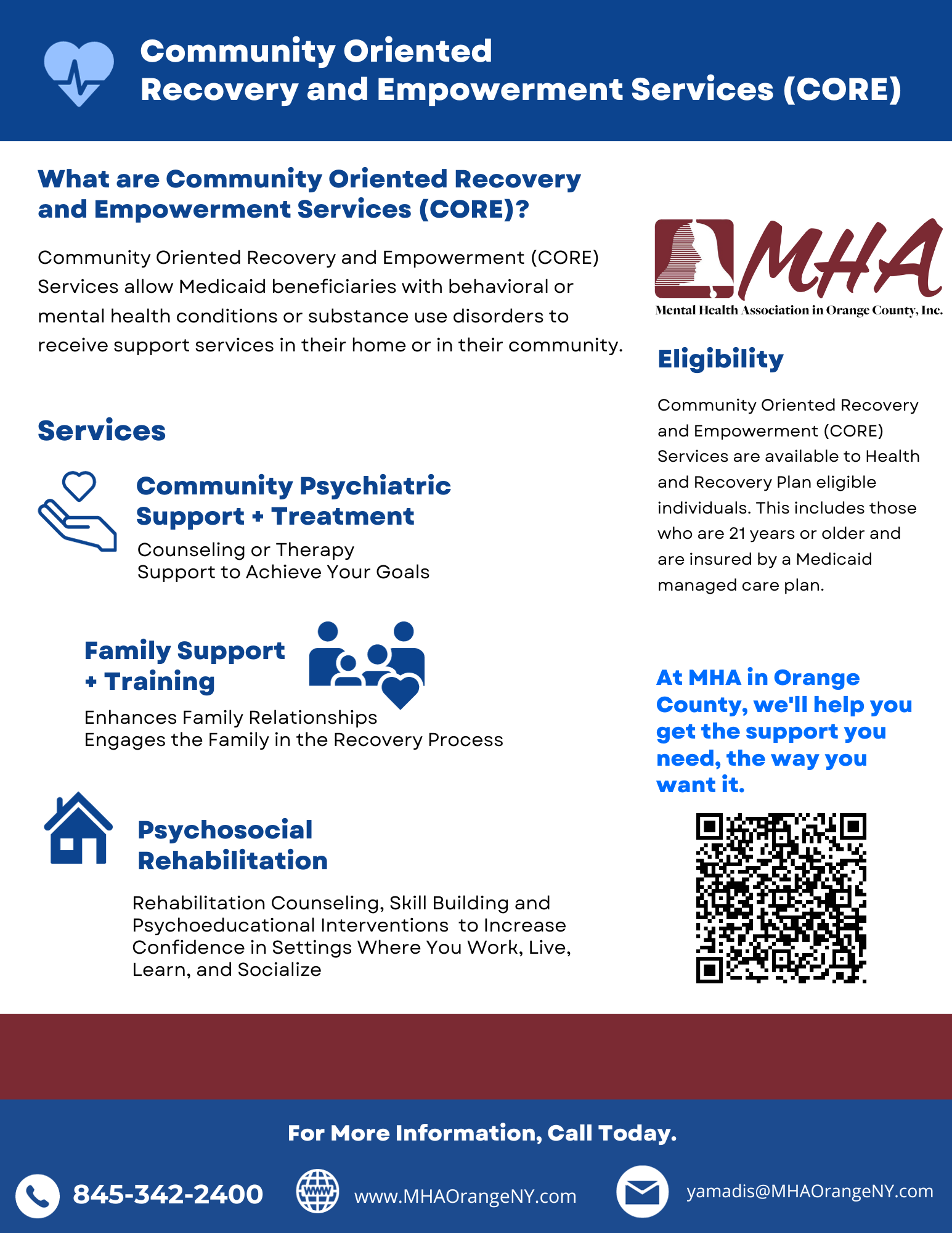 CORE services are available to adults (age 21 years and above) who qualify and are enrolled in a Health and Recovery (HARP) plan. The HARP plans in Orange County, NY are Affinity Enriched Health, MVP Harmonious Health Care Plan, HealthierLife (Fidelis), and Wellness4me Plan (United Healthcare).